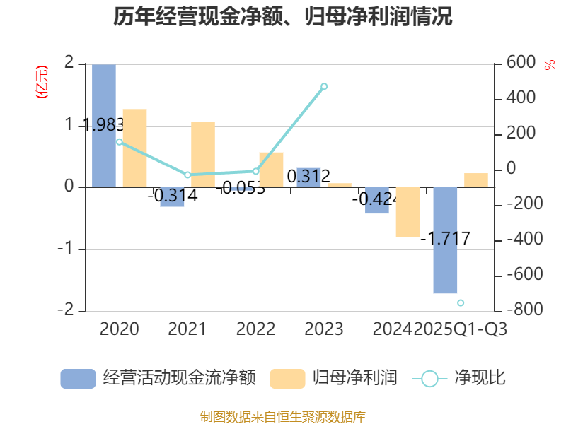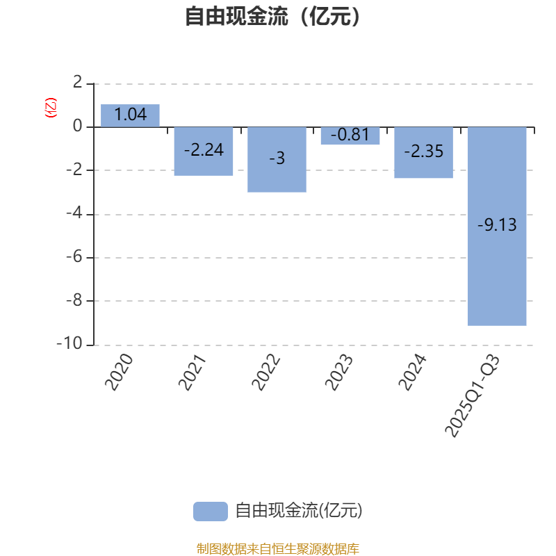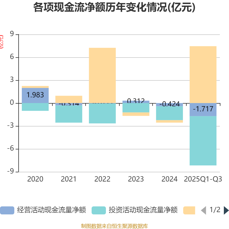 2025年前三季度,公司经营活动现金流净额为-1.72亿元,同比增加1069.05万元;筹资活动现金流净额7.45亿元,同比增加7.89亿元;投资活动现金流净额-6.45亿元,上年同期为-4539.19万元。