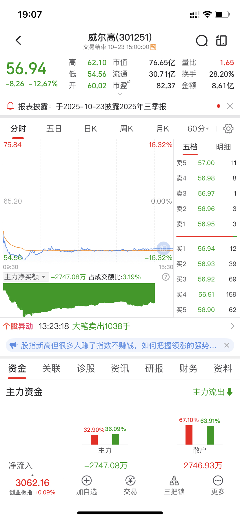 $威尔高(SZ301251)$ 跑了几千万,明天还有一跌。
