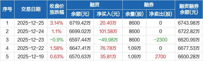 通力科技:融资净买入20.4万元,融资余额6719.42万元(12-25)