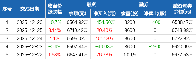通力科技:融资净偿还154.5万元,融资余额6564.92万元(12-26)