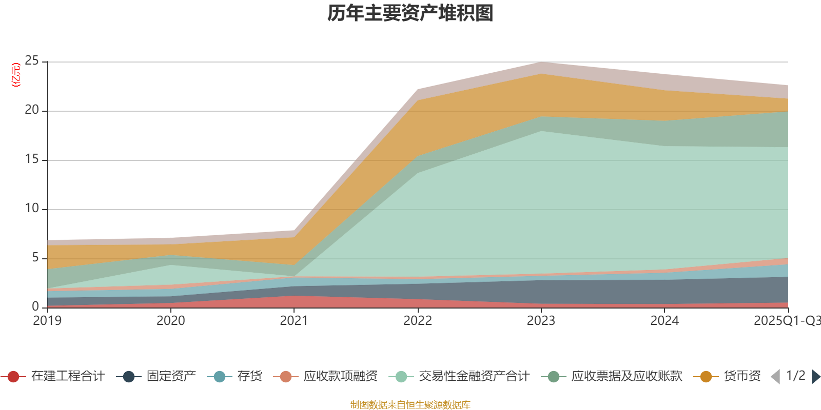 资产重大变化方面,截至2025年三季度末,公司货币资金较上年末减少58.2%,占公司总资产比重下降7.35个百分点;应收票据及应收账款较上年末增加40.88%,占公司总资产比重上升5.21个百分点;交易性金融资产合计较上年末减少10.14%,占公司总资产比重下降2.98个百分点;存货较上年末增加76.19%,占公司总资产比重上升2.59个百分点。