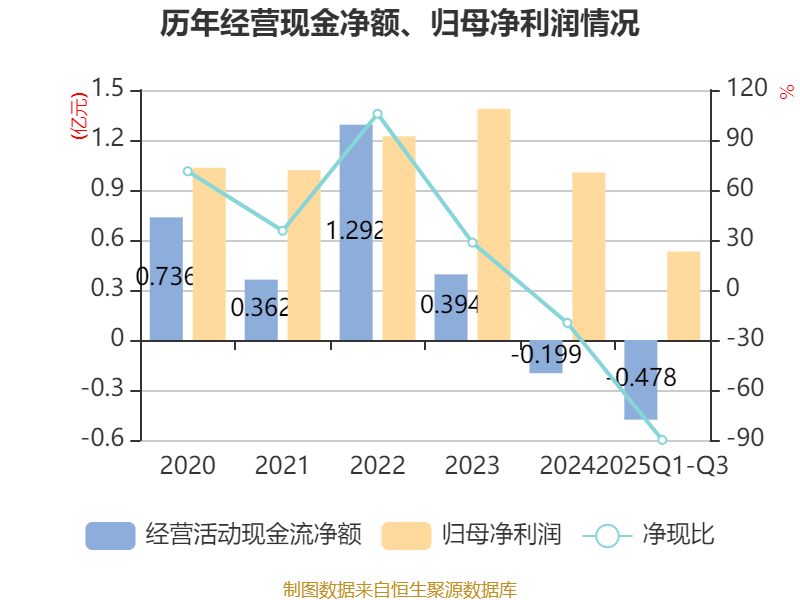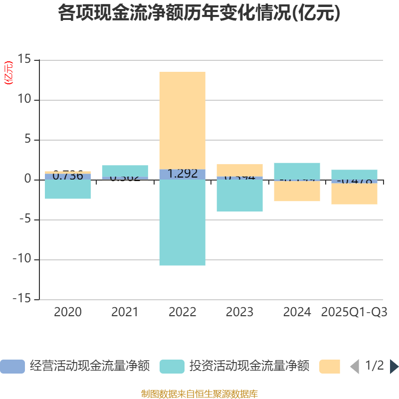 2025年前三季度,公司经营活动现金流净额为-4776.92万元,同比减少3238.25万元;筹资活动现金流净额-2.63亿元,同比减少3.37亿元;投资活动现金流净额1.23亿元,上年同期为-2.62亿元。