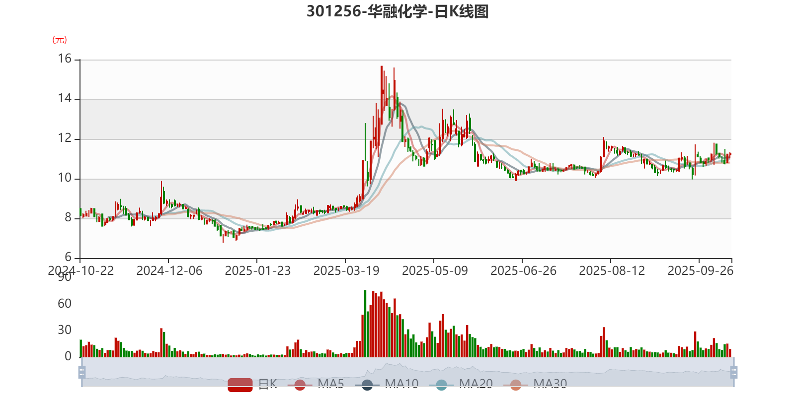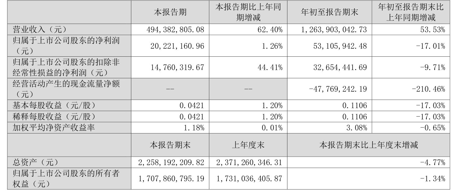 中证智能财讯华融化学(301256)10月22日披露2025年第三季度报告。前三季度公司实现营业总收入12.64亿元,同比增长53.53%;归母净利润5310.59万元,同比下降17.01%;扣非净利润3265.44万元,同比下降9.71%;经营活动产生的现金流量净额为-4776.92万元,上年同期为-1538.67万元;报告期内,华融化学基本每股收益为0.1106元,加权平均净资产收益率为3.08%。