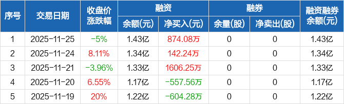 华融化学融资融券信息显示,2025年11月25日融资净买入874.08万元;融资余额1.43亿元,创历史新高,较前一日增加6.51%。