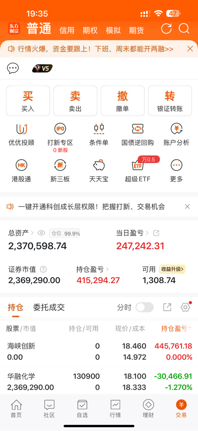 $华融化学(SZ301256)$ $海峡创新(SZ300300)$ 各位股友,跟大家汇报一下我今天的账户盈利24.7w 今天可谓是刺激啊,今天回头看昨天冲高没走是正确的。今天冲高我也是干净利索的清仓了。我的操作都是公布的可以翻看我之前的帖子!今天开新仓,希望明天继续吃肉。不说了大家记得点赞评论178