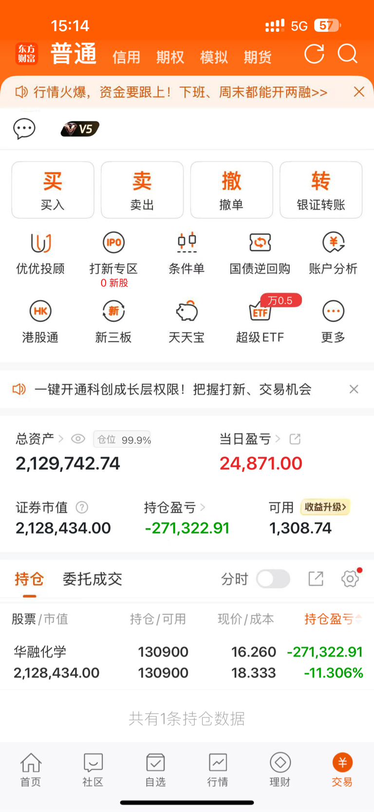 $华融化学(SZ301256)$ 各位股友!今日账户回血2.4w,早盘冲高一度看到回本希望,没想到下午回落有点小遗憾~ 下周继续冲,目标稳稳盈利!记得点赞评论178,好运跟着咱们走~