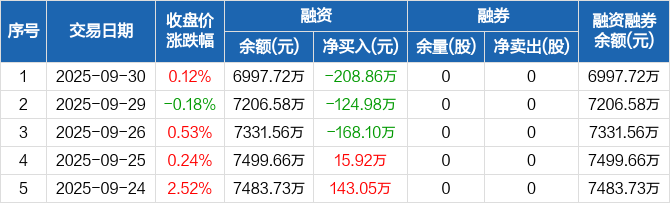 富士莱:连续3日融资净偿还累计501.94万元(09-30)