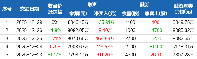 富士莱:融资净偿还35.91万元,融资余额8046.15万元(12-29)
