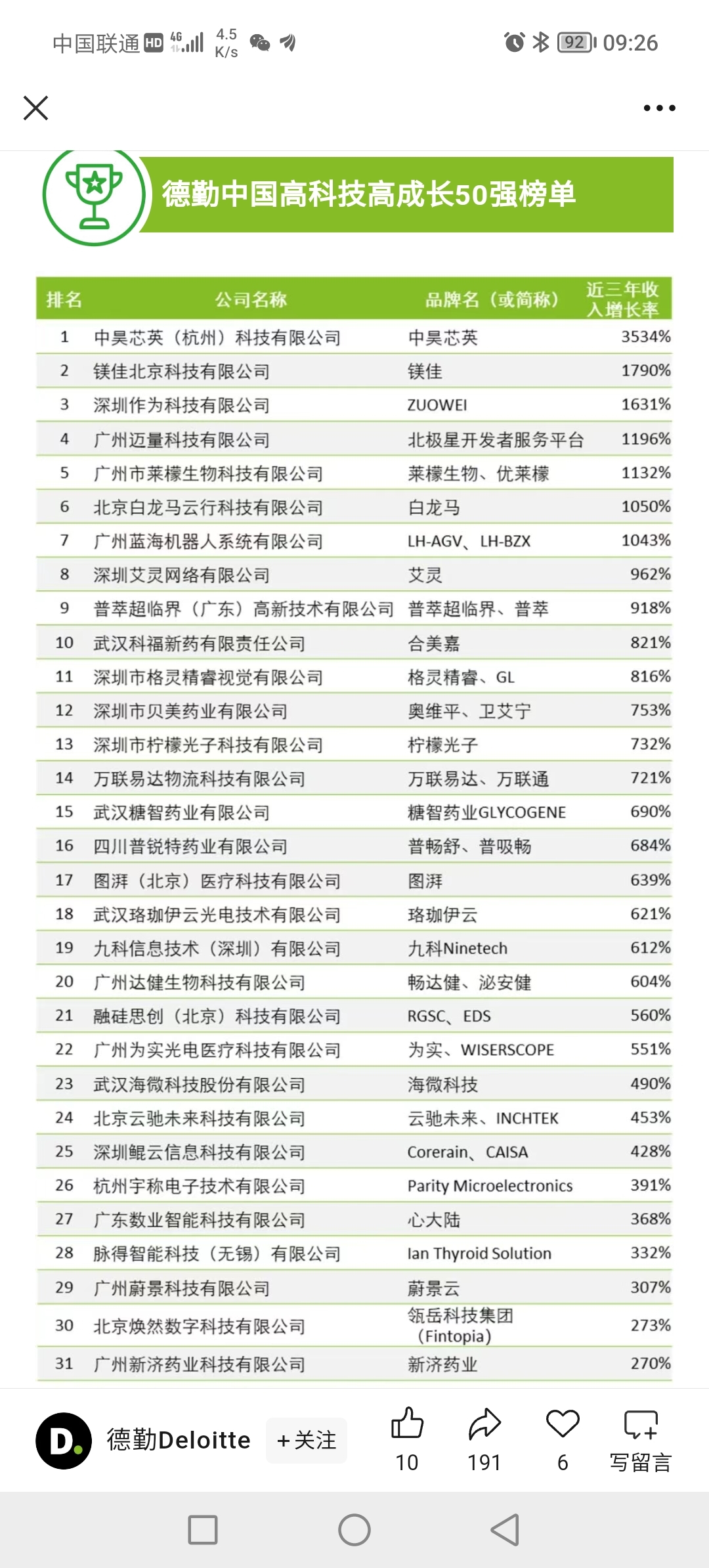 $艾布鲁(SZ301259)$ 中昊芯英入选德勤高科技高成长50强。德勤高科技高成长评选项目1995年创办于美国硅谷,2005年进入中国,每年在数十个国家和地区举办。历年榜单中涌现出许多行业翘楚,如:腾讯、阿里巴巴、百度、京东、中芯国际、药明康德、字节跳动、苹果、微软、谷歌、特斯拉、英伟达等。企业入选榜单时通常处于早期阶段,该榜单又被誉为“伟大科技企业的摇篮”。