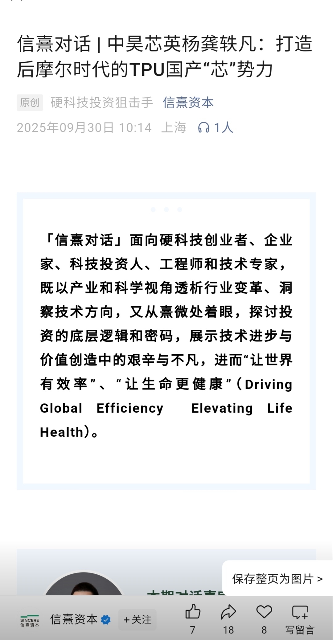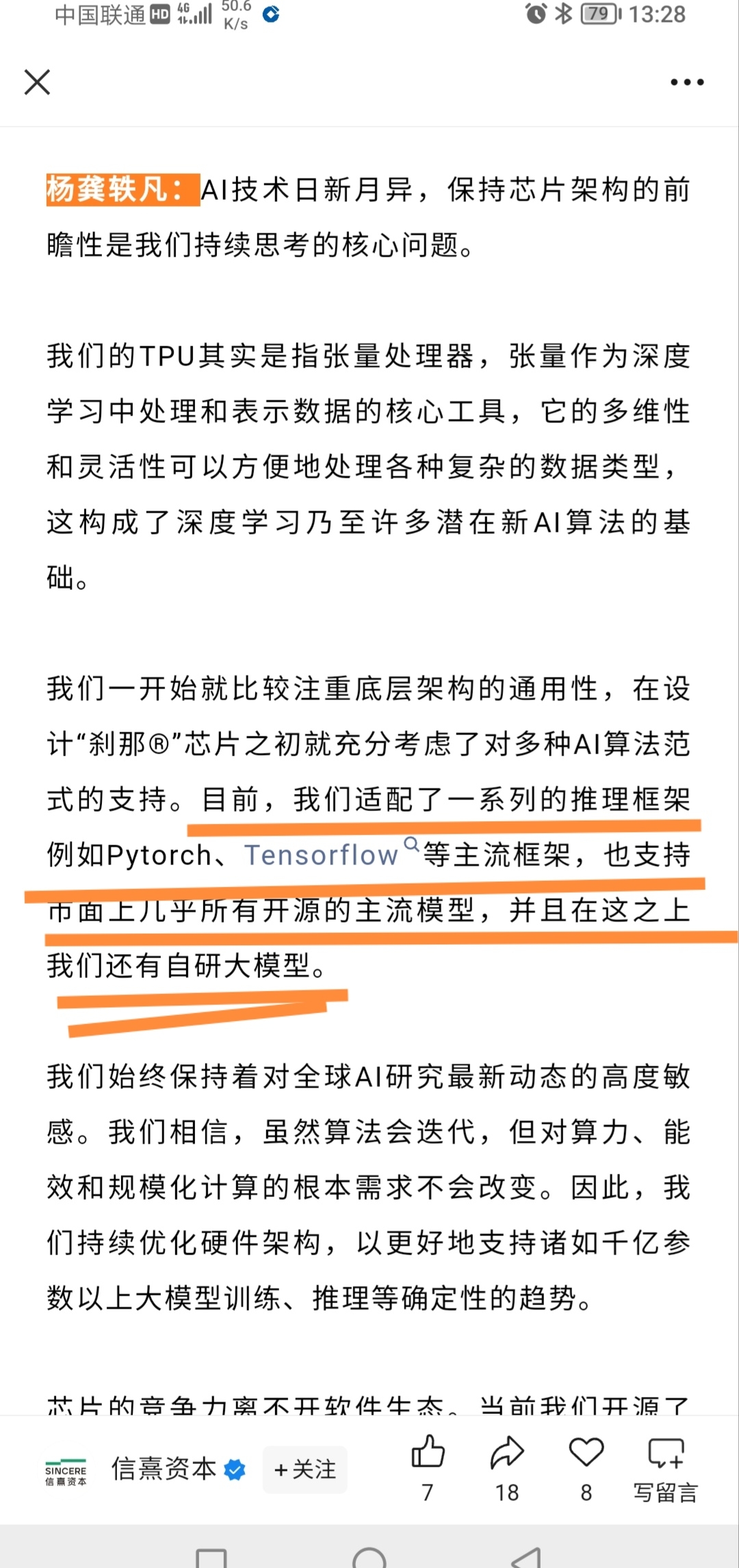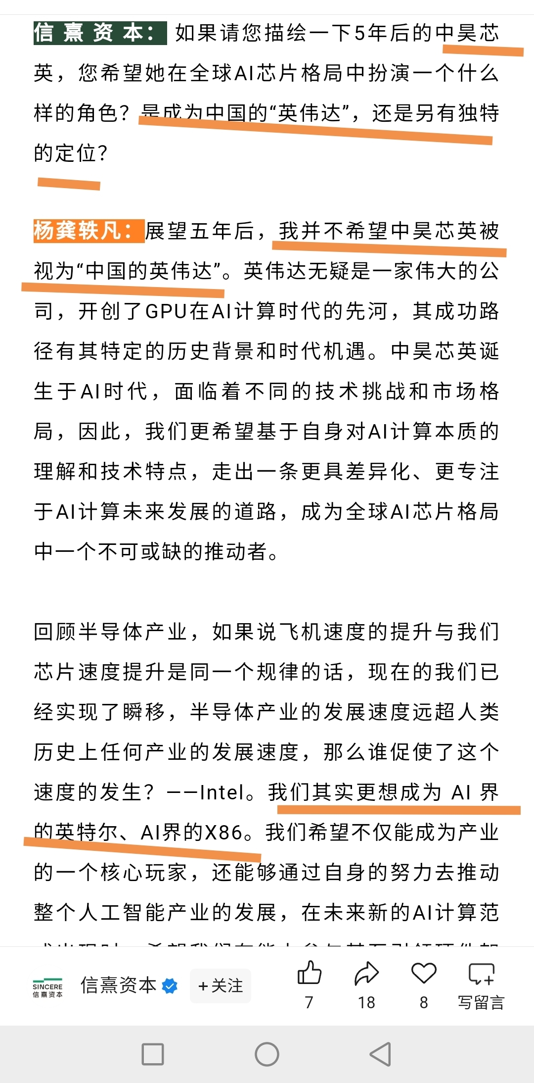 $艾布鲁(SZ301259)$ $科德教育(SZ300192)$ $天普股份(SH605255)$ 信熹资本新发文,中昊芯英CEO杨龚轶凡采访。新内容主要为红线部分:刹那适配各类主流算法,几乎适配所有大模型,中昊芯英有自己的大模型。杨龚轶凡不愿做中国的英伟达,要做中昊的英特尔——愿意做真正的开拓者。