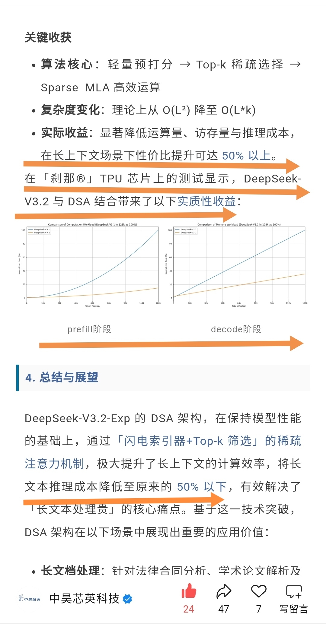 $艾布鲁(SZ301259)$ $天普股份(SH605255)$ $科德教育(SZ300192)$ 今日中昊芯英官方公众号的新文,等于官宣:艾布鲁算力基地运行DeepseekV3.2E(9月29发布)相较DS3.1(8月21发布)推理成本降低50%,即性能翻1倍!要知道上半年中昊芯英就官宣一个集群可以从原来的200P上升到400P!且是TF32精度下。大家可估算下艾布鲁的总算力!仅1.65亿