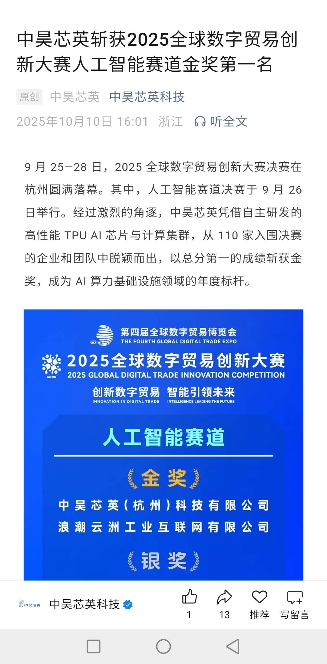 中昊芯英官网新发文,获2025全球数贸创新大赛金奖。众所周知,我两星期前就挖掘出