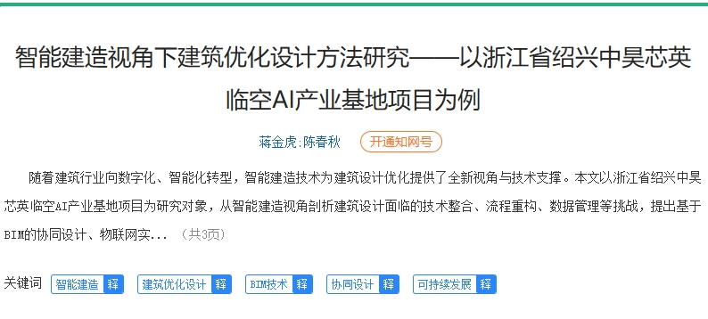 $艾布鲁(SZ301259)$ $科德教育(SZ300192)$ $天普股份(SH605255)$ 住建部主办的学术月刊《住宅产业》2025年08期,刊登“智能建造视角下建筑优化设计方法研究——以浙江省绍兴中昊芯英临空 AI 产业基地项目为例”一文。有想了解的请自行花钱看。