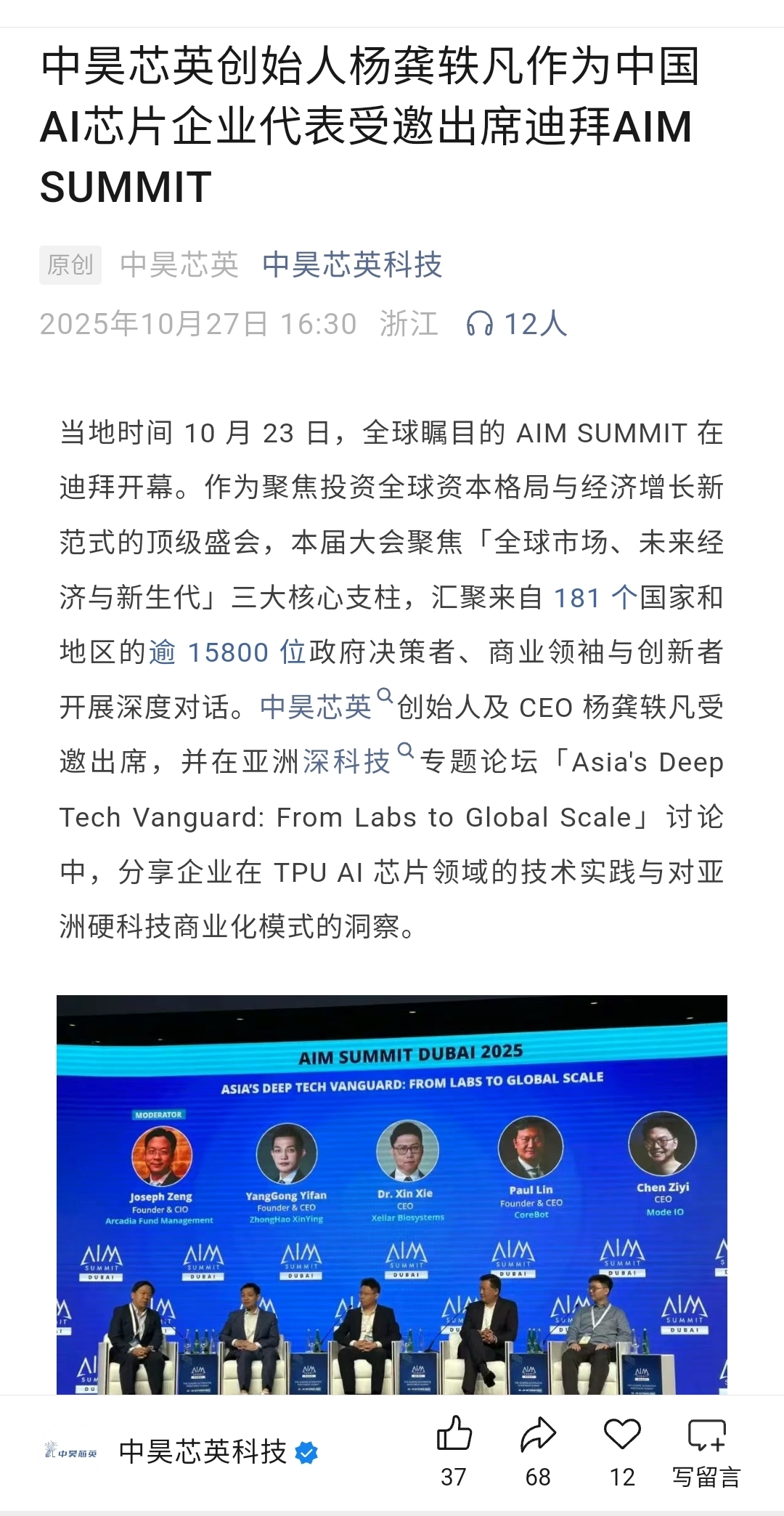 $艾布鲁(SZ301259)$ $科德教育(SZ300192)$ $天普股份(SH605255)$ 中昊芯英官方公众号新文:创始人杨龚轶凡作为中国AI芯片企业代表受邀出席迪拜AIM SUMMIT——没啥新内容。
