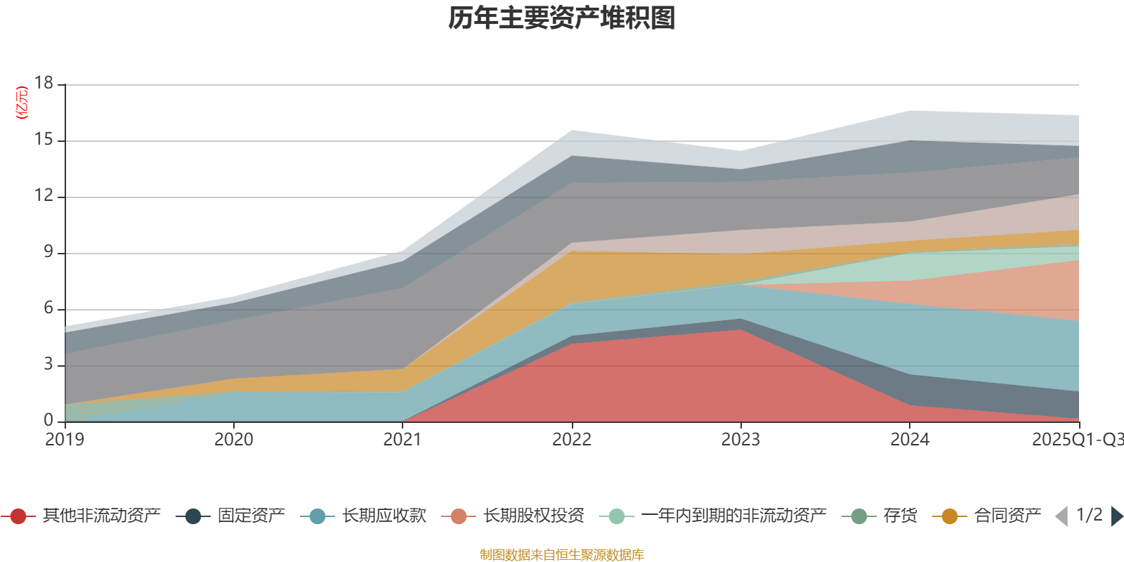资产重大变化方面,截至2025年三季度末,公司长期股权投资较上年末增加159.96%,占公司总资产比重上升12.35个百分点;货币资金较上年末减少64.23%,占公司总资产比重下降6.58个百分点;交易性金融资产合计较上年末增加85.51%,占公司总资产比重上升5.46个百分点;一年内到期的非流动资产较上年末减少50.21%,占公司总资产比重下降4.39个百分点。