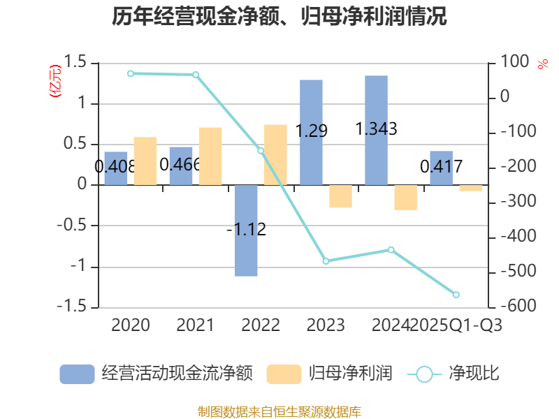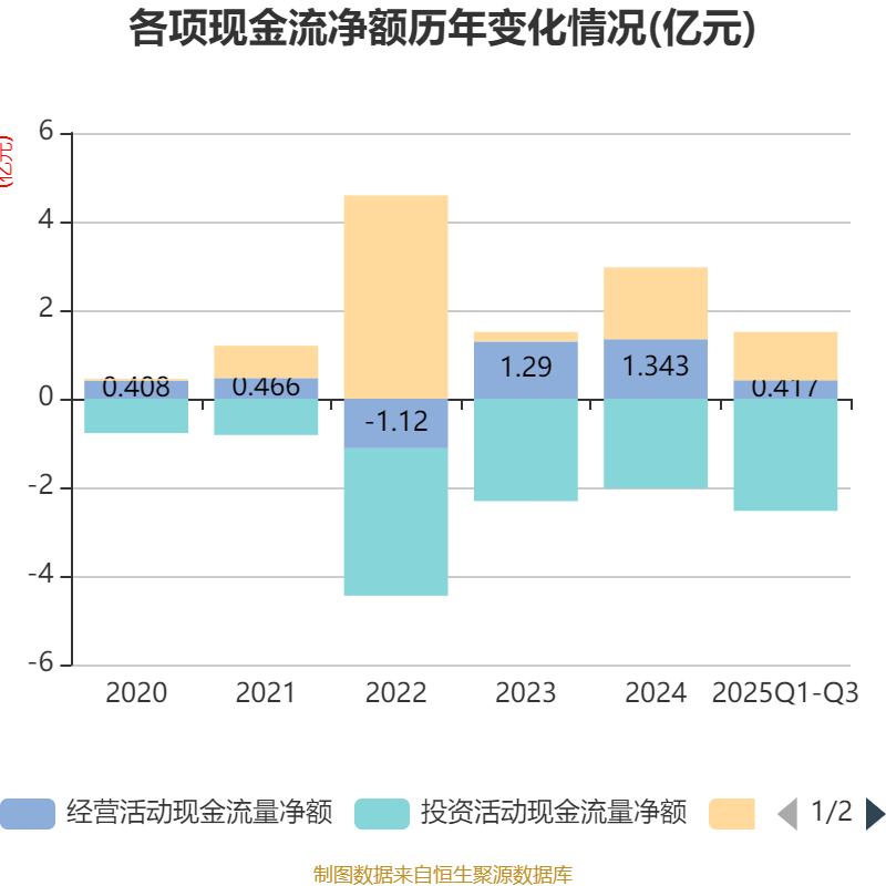 2025年前三季度,公司经营活动现金流净额为4173.35万元,同比增长61.28%;筹资活动现金流净额1.09亿元,同比增加102.84万元;投资活动现金流净额-2.53亿元,上年同期为-5219.08万元。