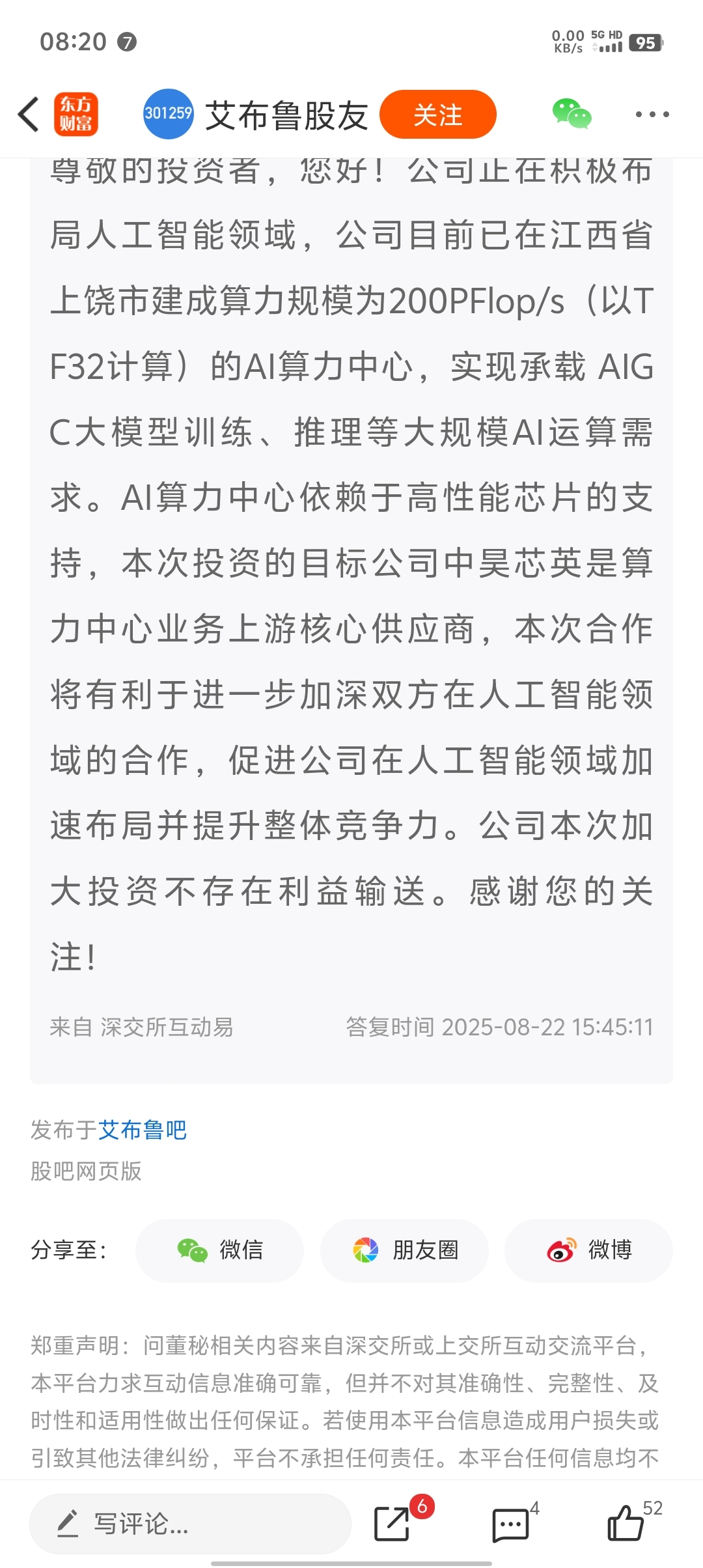温馨提示: 1.根据《证券法》规定,禁止编造、传播虚假信息或者误导性信息,扰乱证券市场;2.用户在本社区发表的所有资料、言论等仅代表个人观点,与本网站立场无关,不对您构成任何投资建议。用户应基于自己的独立判断,自行决定证券投资并承担相应风险。《东方财富社区管理规定》