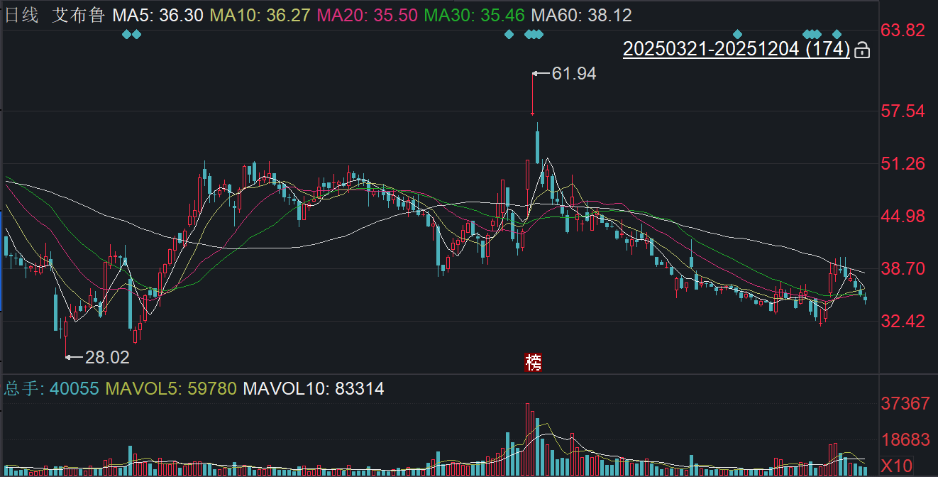 二级市场上,截至12月4日收盘,艾布鲁下跌1.86%报34.76元/股,总市值约54.23亿元,今年来公司股价累计下跌近三成。