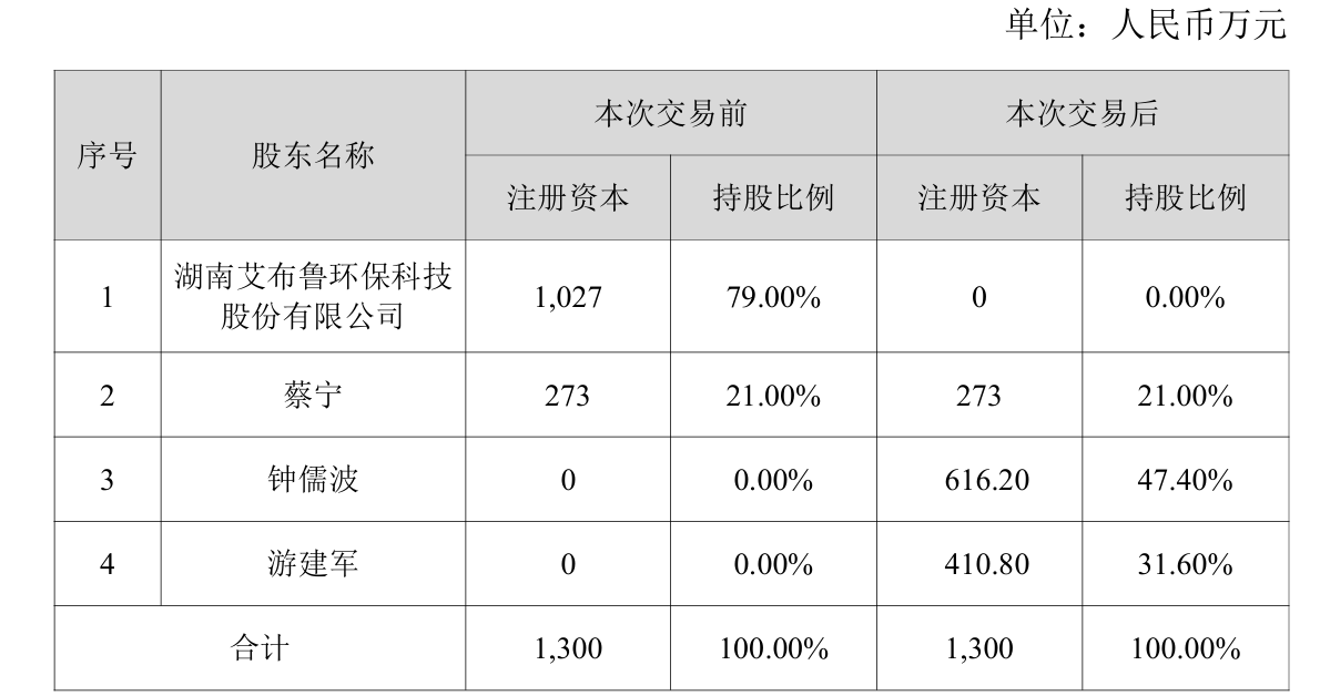 12月4日晚间,艾布鲁(301259)发布公告称,公司拟将持有的控股子公司金鹊农业79%的股权转让给实控人钟儒波和大股东游建军,本次交易的转让价款合计为1239.14万元。