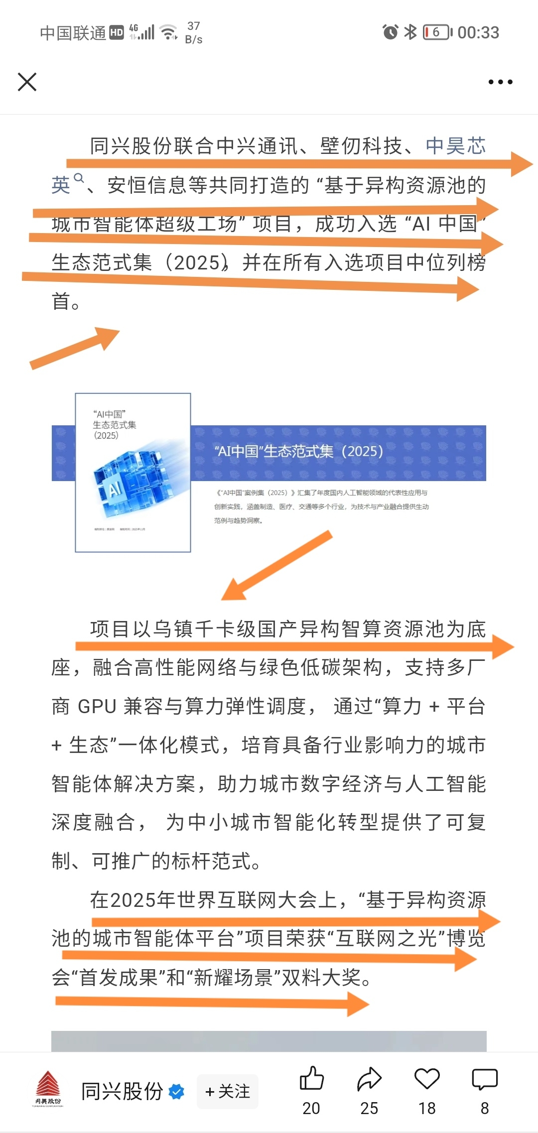 $艾布鲁(SZ301259)$ $科德教育(SZ300192)$ $天普股份(SH605255)$ 一月前挖掘出来的这个千卡基地获大奖。12月3日,2025企业家博鳌论坛上,同兴股份联合中兴通讯、壁仞科技、中昊芯英、安恒信息等共同打造的 “基于异构资源池的城市智能体超级工场” 项目,成功入选 “AI 中国” 生态范式集(2025),并在所有入选项目中位列榜首。