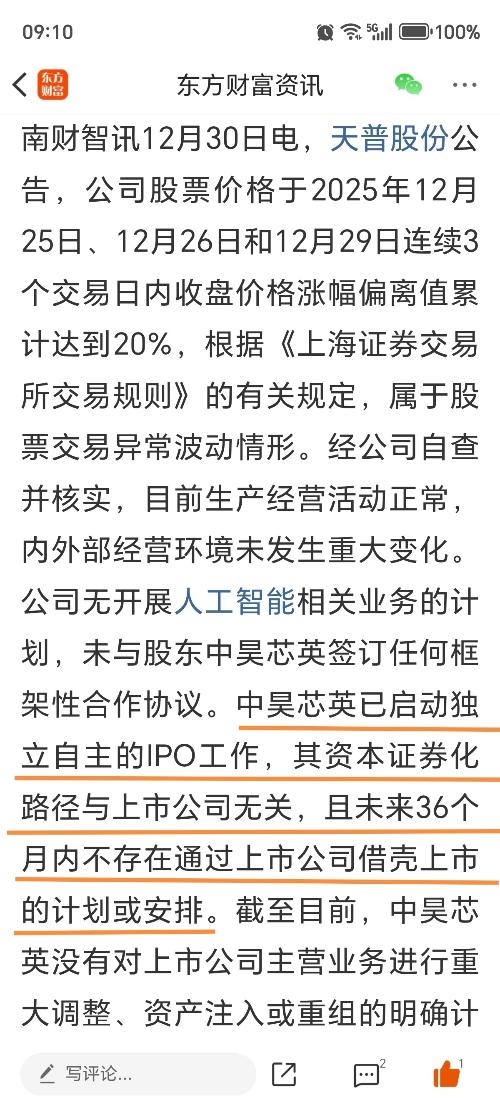 南财智讯12月30日电,天普股份公告,公司股票价格于2025年12月25日、12月26日和12月29日连续3个交易日内收盘价格涨幅偏离值累计达到20%,根据《上海证券交易所交易规则》的有关规定,属于股票交易异常波动情形。经公司自查并核实,目前生产经营活动正常,内外部经营环境未发生重大变化。公司无开展人工智能相关业务的计划,未与股东中昊芯英签订任何框架性合作协议。中昊芯英已启动独立自主的IPO工作,其资本证券化路径与上市公司无关,且未来36个月内不存在通过上市公司借壳上市的计划或安排。截至目前,中昊芯英没有对上市公司主营业务进行重大调整、资产注入或重组的明确计划。公司主营业务仍为汽车用高分子流体管路系统及密封系统零件及总成,主要应用于传统油车整车制造,未发生重大变化。公司股票自2025年8月22日至12月29日累计上涨643.99%,股价已严重偏离基本面,存在较大交易风险,未来随时有快速下跌的可能。截至2025年12月29日,公司市盈率达816.89倍,市净率达32.93倍,显著高于汽车零部件行业平均水平。公司外部流通盘较小,控股股东及相关方合计持股比例达68.29%,剩余流通股份有限,可能存在非理性炒作风险。2025年前三季度,公司实现营业收入2.30亿元,同比下降4.98%;归母净利润1785.08万元,同比下降2.91%,存在业绩下滑风险。公司股票在近期多次触及异常波动及严重异常波动情形,已发布多次风险提示公告。敬请投资者注意投资风险,理性决策。