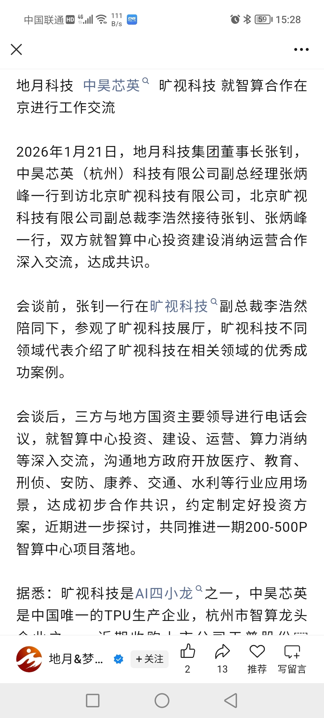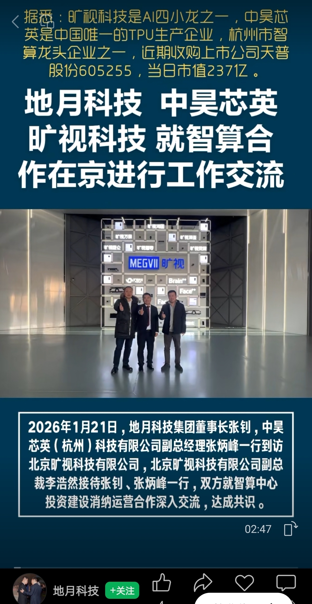 $艾布鲁(SZ301259)$ $科德教育(SZ300192)$ $天普股份(SH605255)$ 2026年1月21日,地月科技官方公众号和视频号分别发布,地月科技董事长和中昊芯英副总经理张炳峰一行到访北京旷视,副总裁接见。首先是参观,然后三方与地方国资主要领导进行电话会议,双方达成共识共同推进一期200-500P智算中心项目落地。等于1-2.5个艾布鲁算力基地。