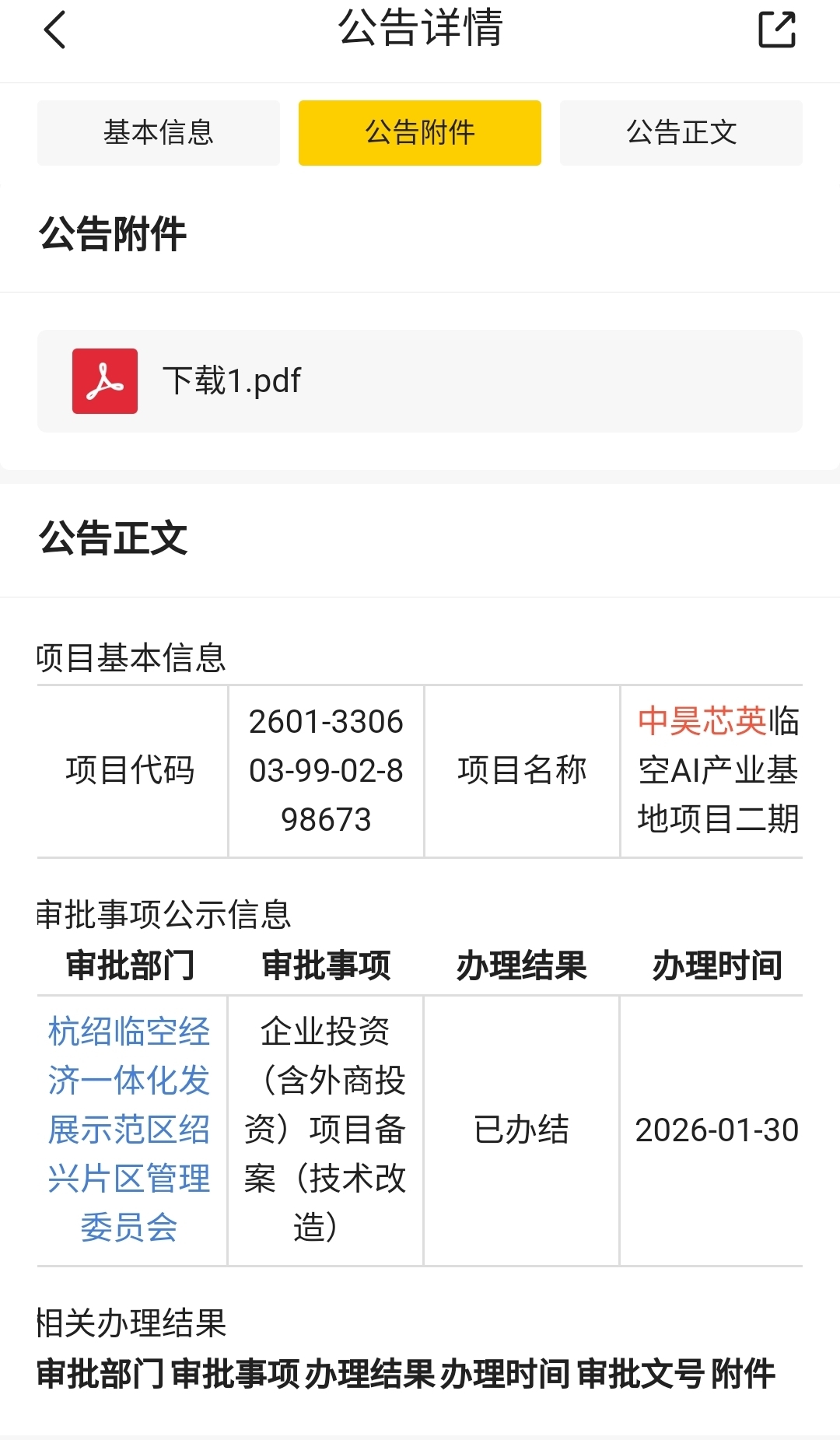 中昊绍兴临空ai产业基地二期项目已备案公告:拟投资10亿元,自有厂房约22979