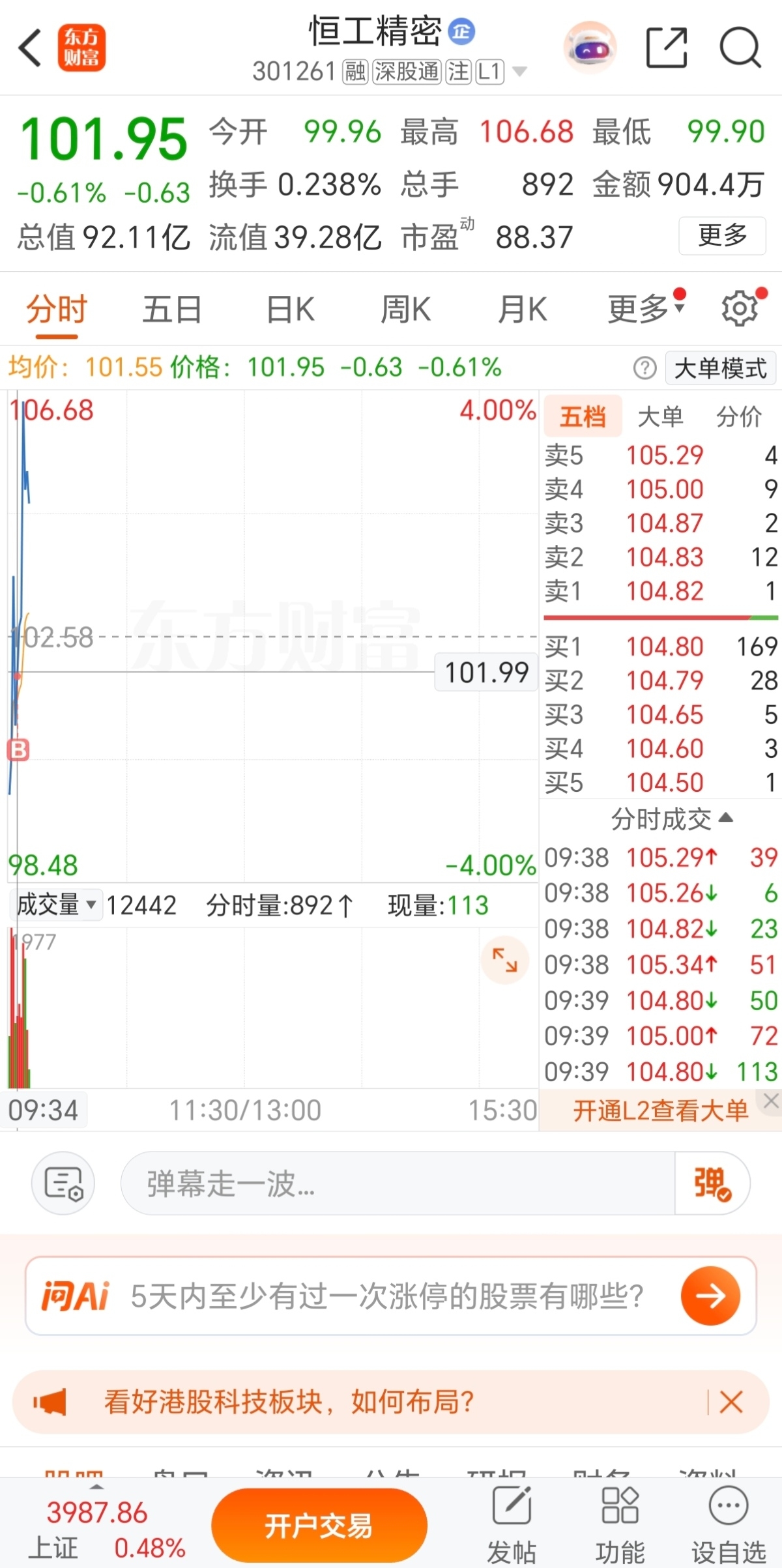 101.99,水下低吸$恒工精密(SZ301261)$