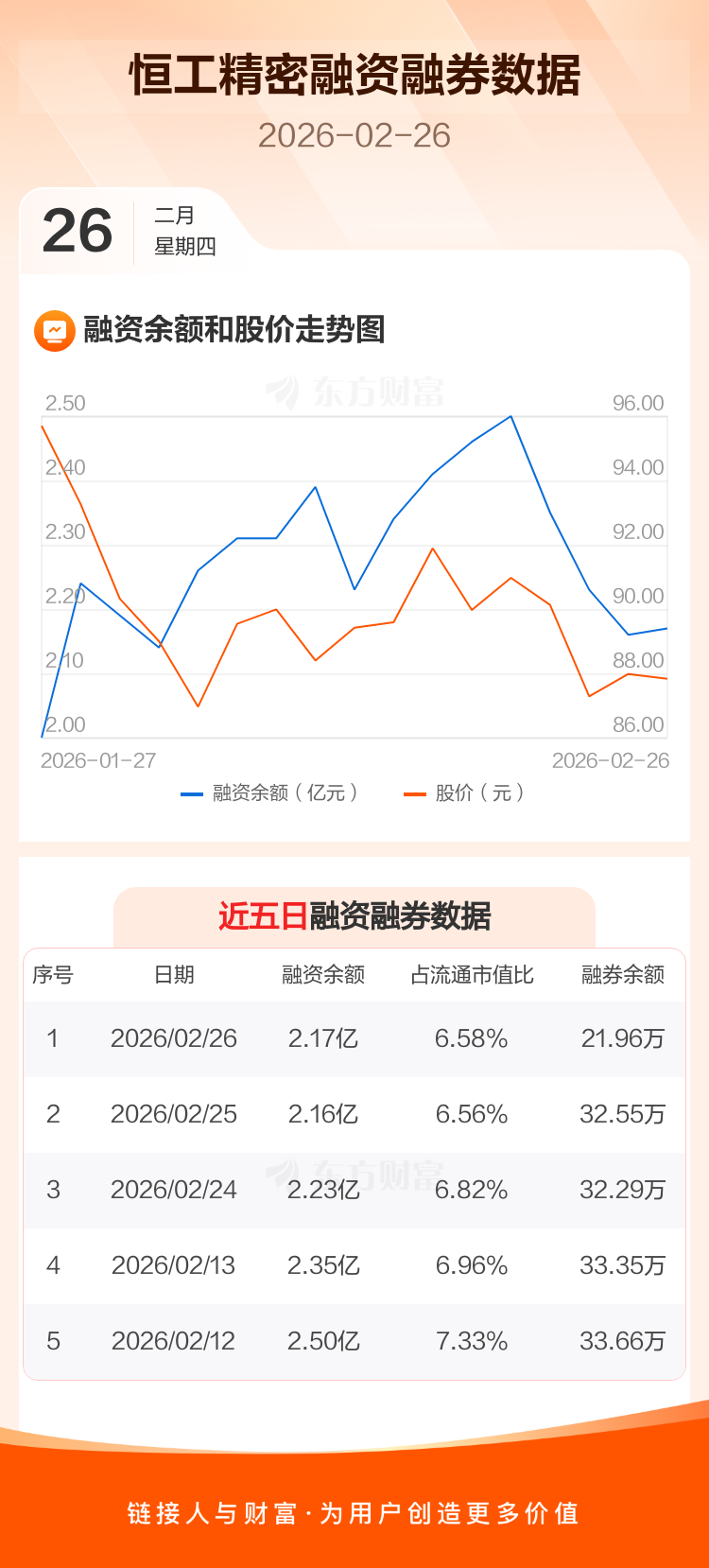 交易所最新数据显示,恒工精密于2026年2月26日获融资买入1405.71万元,融资偿还1371.51万元,当日融资净买入34.2万元。目前,该股融资余额2.17亿,占流通市值比例为6.58%。