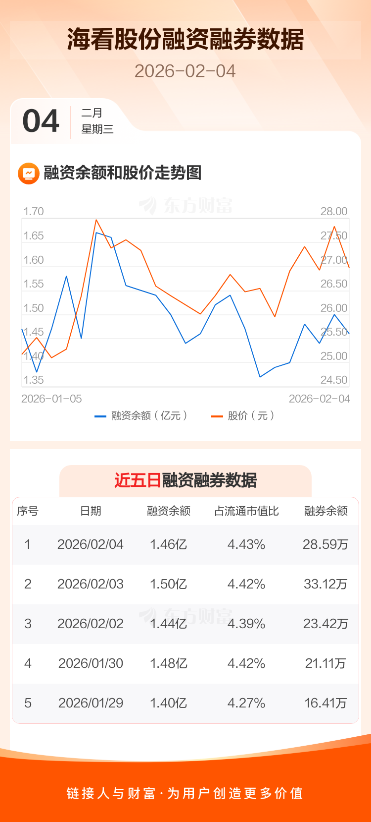 交易所最新数据显示,海看股份于2026年2月4日获融资买入1590.77万元,融资偿还2029.24万元,当日融资净偿还438.48万元。目前,该股融资余额1.46亿,占流通市值比例为4.43%。