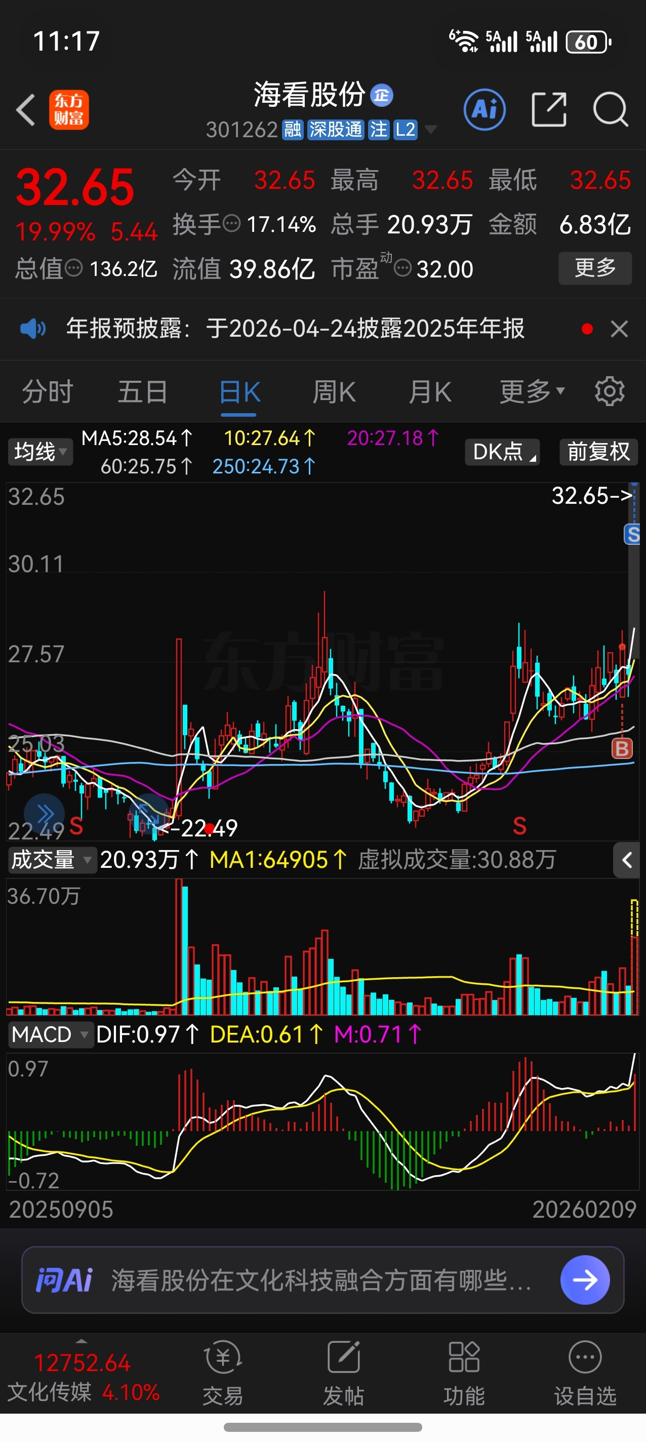 $海看股份(SZ301262)$ 跑了,年前红包到手。
