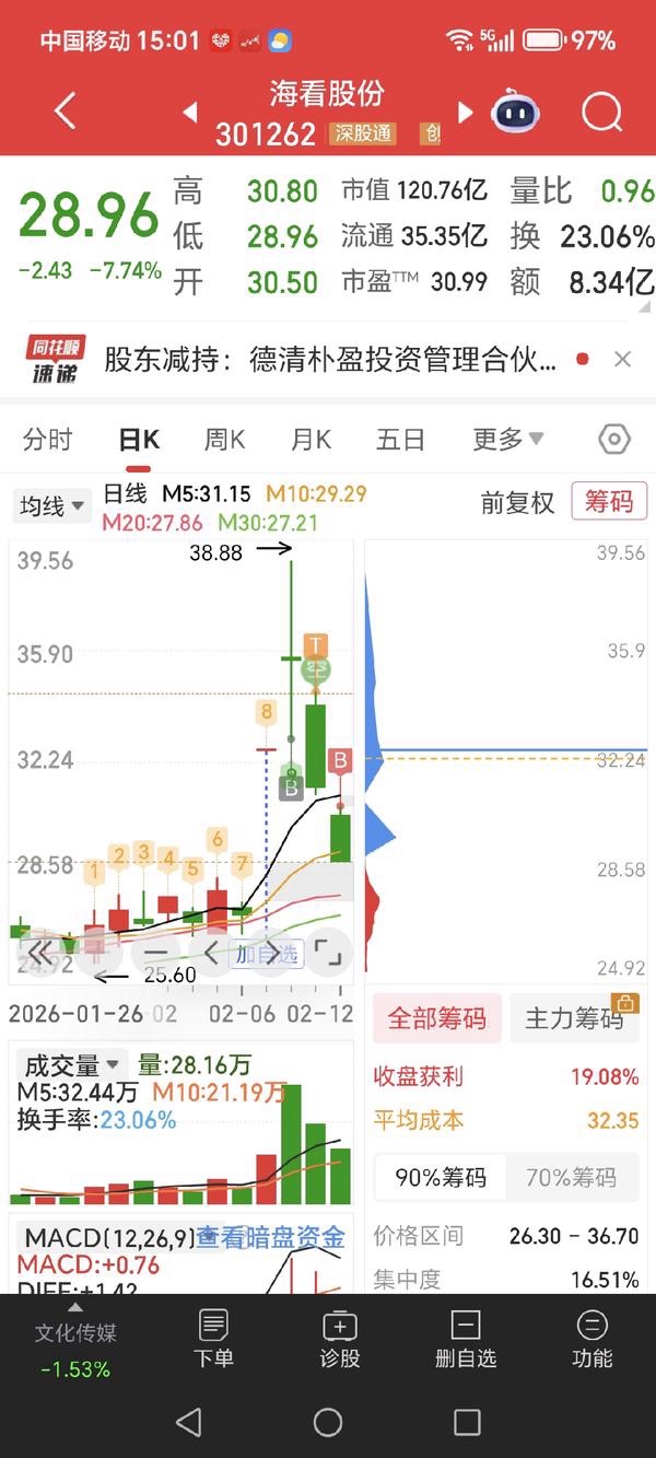$海看股份(SZ301262)$ 买早的散户疯狂补仓,没买的总想着抄别人的底,总之越跌散户越多,无限循环,直到下次缩量盘整横盘之后开始磨底,起码半年起步了,暂时看个腰斩