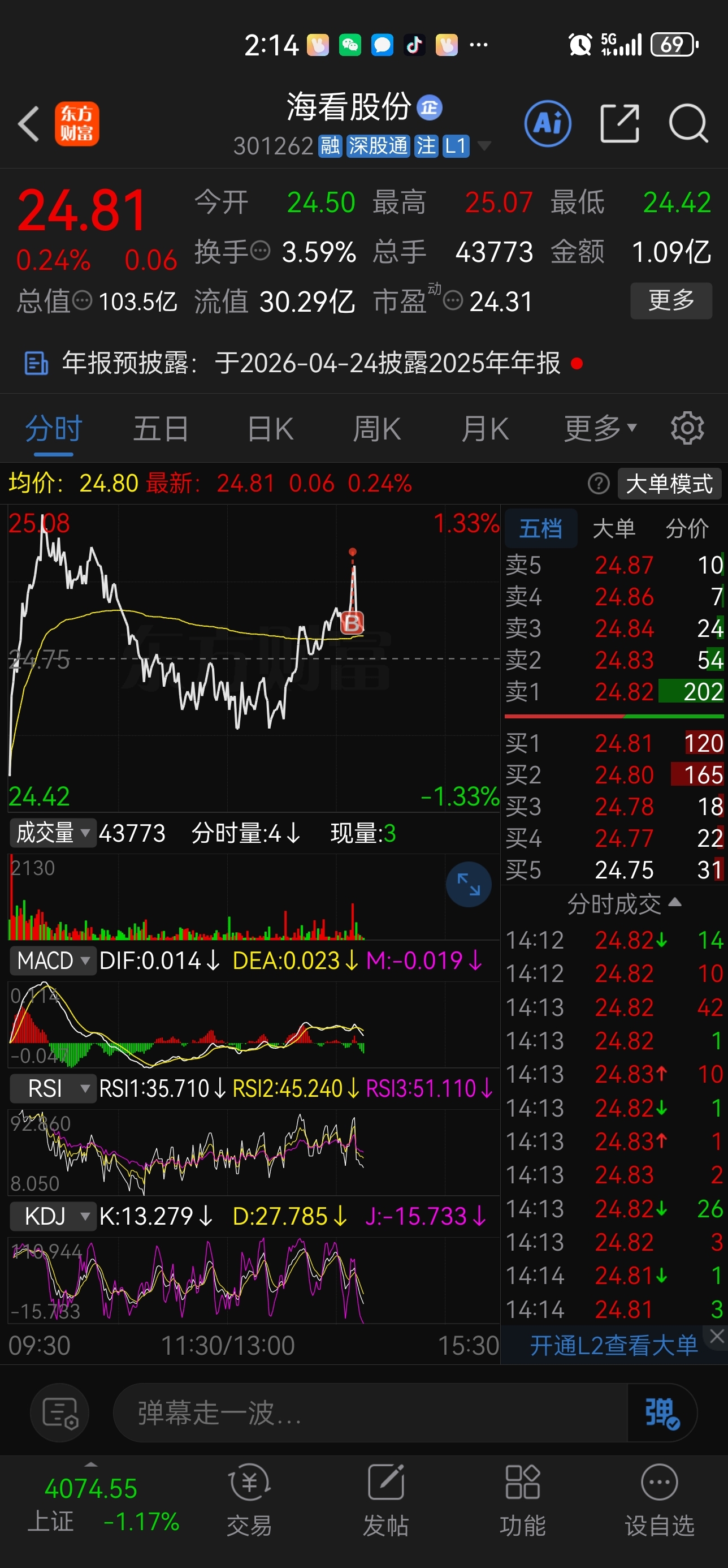 $海看股份(SZ301262)$ 我就买了一手,量化牛逼。