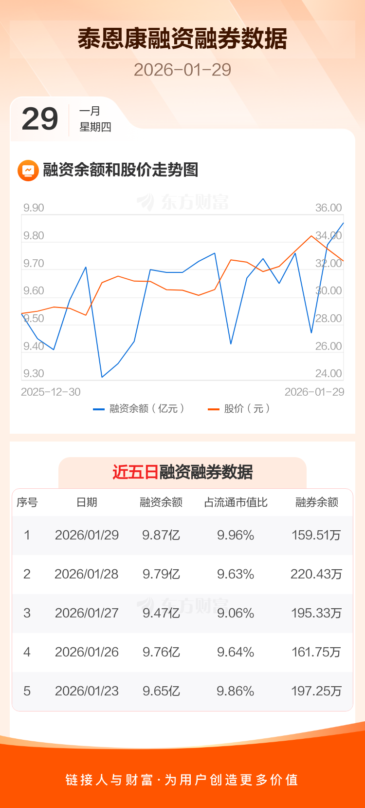 交易所最新数据显示,泰恩康于2026年1月29日获融资买入3818.51万元,融资偿还3074.00万元,当日融资净买入744.51万元。目前,该股融资余额9.87亿,占流通市值比例为9.96%。
