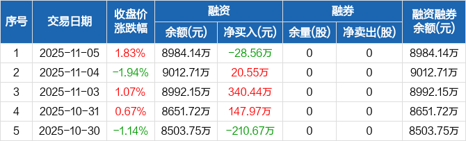 宇邦新材:融资净偿还28.56万元,融资余额8984.14万元(11-05)
