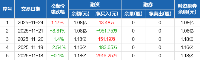 宇邦新材:融资净买入13.48万元,融资余额1.08亿元(11-24)