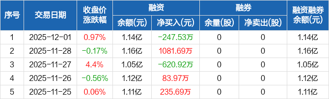 宇邦新材:融资净偿还247.53万元,融资余额1.14亿元(12-01)