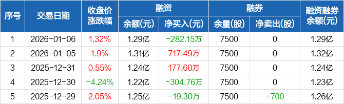 宇邦新材:融资净偿还282.15万元,融资余额1.29亿元(01-06)