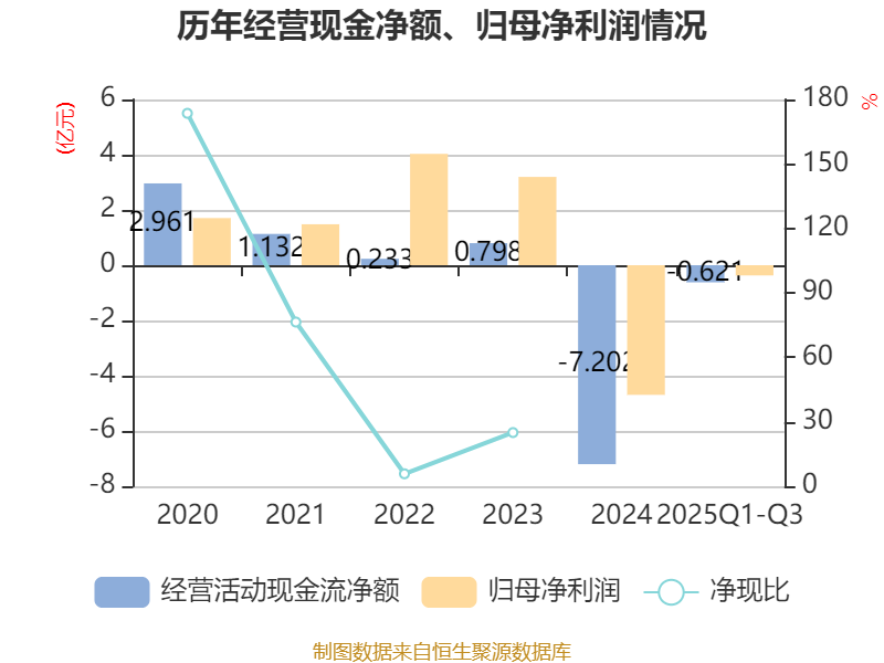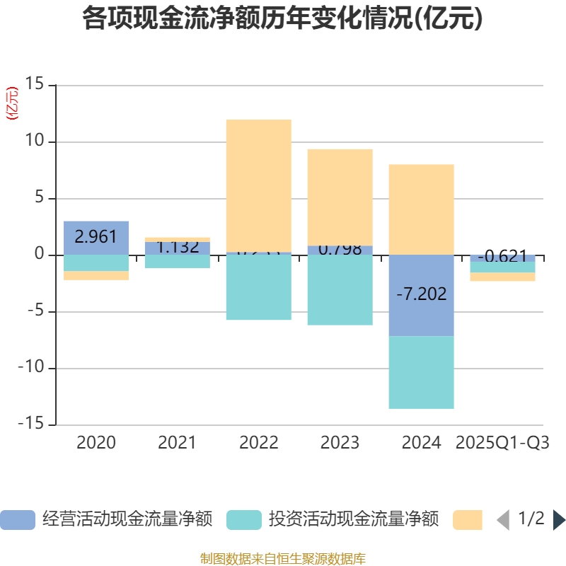2025年前三季度,公司经营活动现金流净额为-6208.58万元,同比增加3.97亿元;筹资活动现金流净额-7471.16万元,同比减少7.01亿元;投资活动现金流净额-9686.48万元,上年同期为-8.36亿元。
