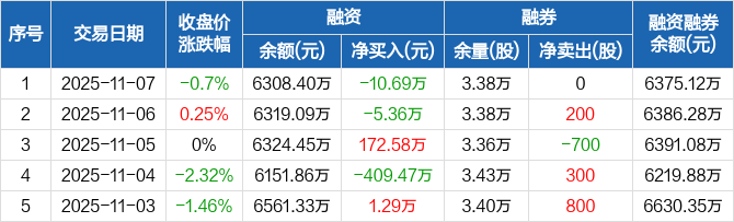 铭利达:融资净偿还10.69万元,融资余额6308.4万元(11-07)