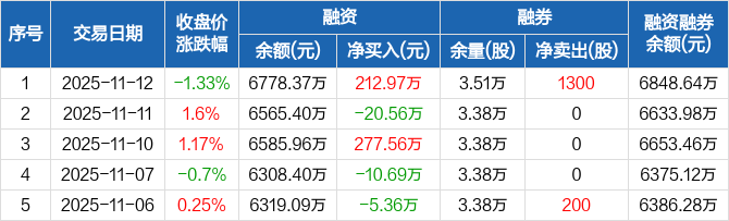 铭利达:融资净买入212.97万元,融资余额6778.37万元(11-12)