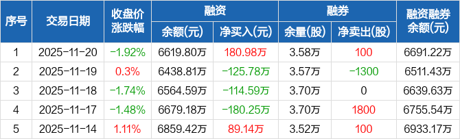 铭利达:融资净买入180.98万元,融资余额6619.8万元(11-20)
