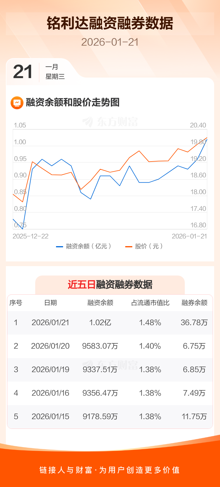 交易所最新数据显示,铭利达于2026年1月21日获融资买入1766.68万元,融资偿还1126.06万元,当日融资净买入640.62万元。目前,该股融资余额1.02亿,占流通市值比例为1.48%。