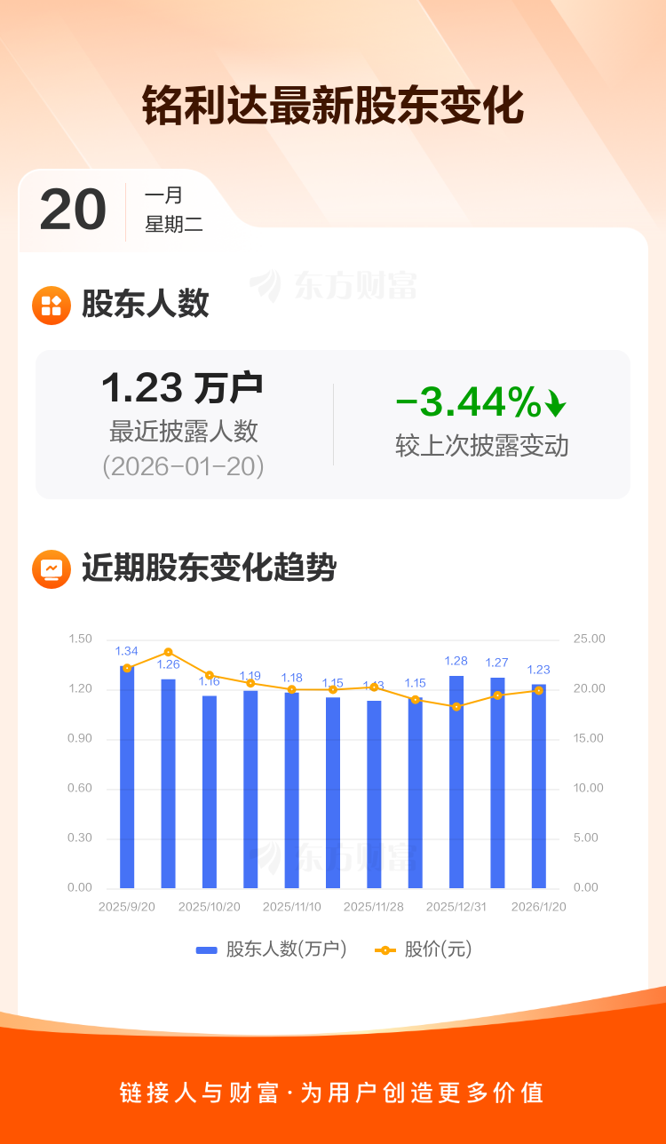 铭利达最新披露数据显示,截至1月20日公司股东户数为1.23万户,较上期(2026年1月10日)减少436户,降幅为3.44%。户均持有流通股数量由上期的2.72万股上升至2.81万股,户均持股金额由上期的52.65万元增加至55.88万元。