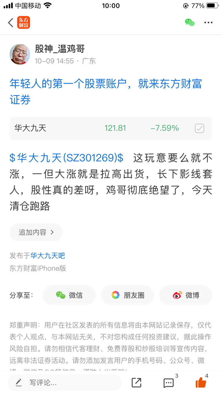 温馨提示: 1.根据《证券法》规定,禁止编造、传播虚假信息或者误导性信息,扰乱证券市场;2.用户在本社区发表的所有资料、言论等仅代表个人观点,与本网站立场无关,不对您构成任何投资建议。用户应基于自己的独立判断,自行决定证券投资并承担相应风险。《东方财富社区管理规定》