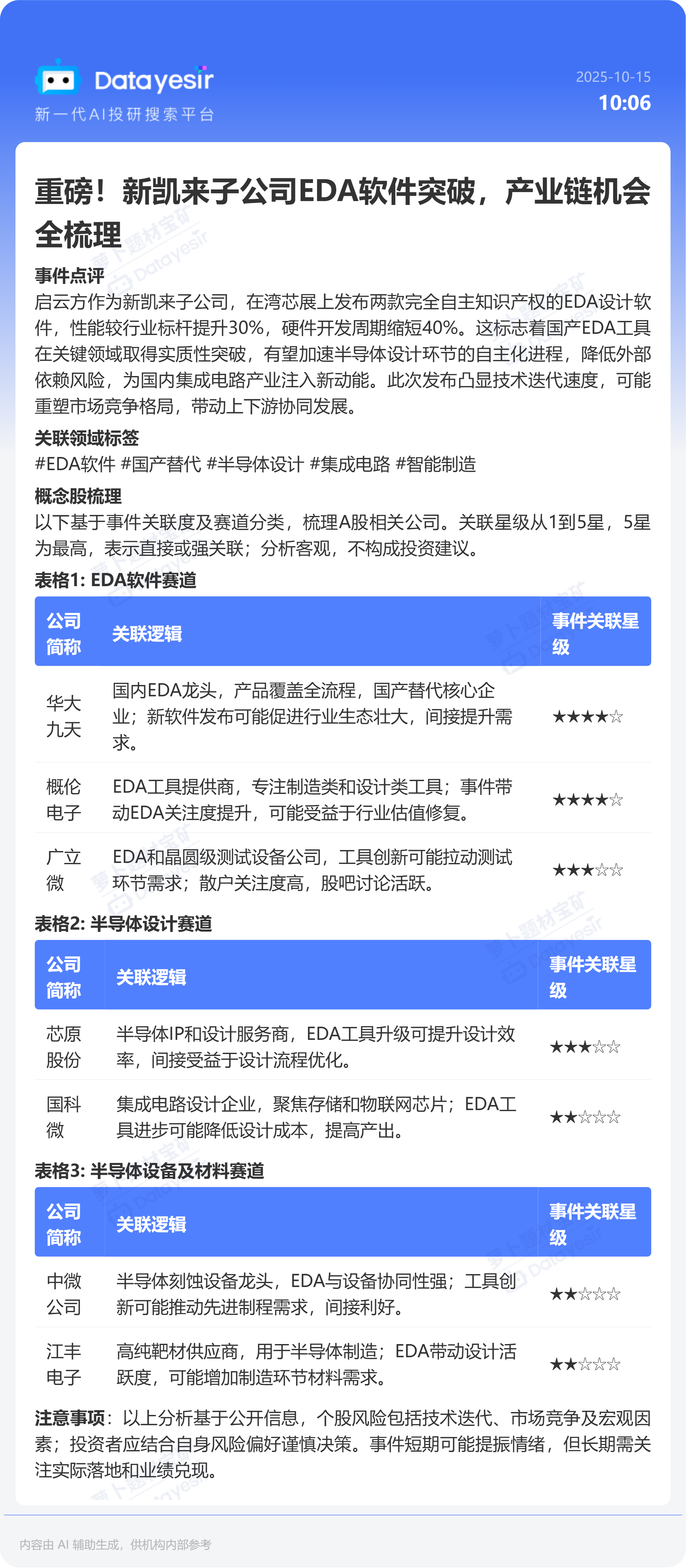 启云方作为新凯来子公司,在湾芯展上发布两款完全自主知识产权的EDA设计软件,性能较行业标杆提升30%,硬件开发周期缩短40%。这标志着国产EDA工具在关键领域取得实质性突破,有望加速半导体设计环节的自主化进程。