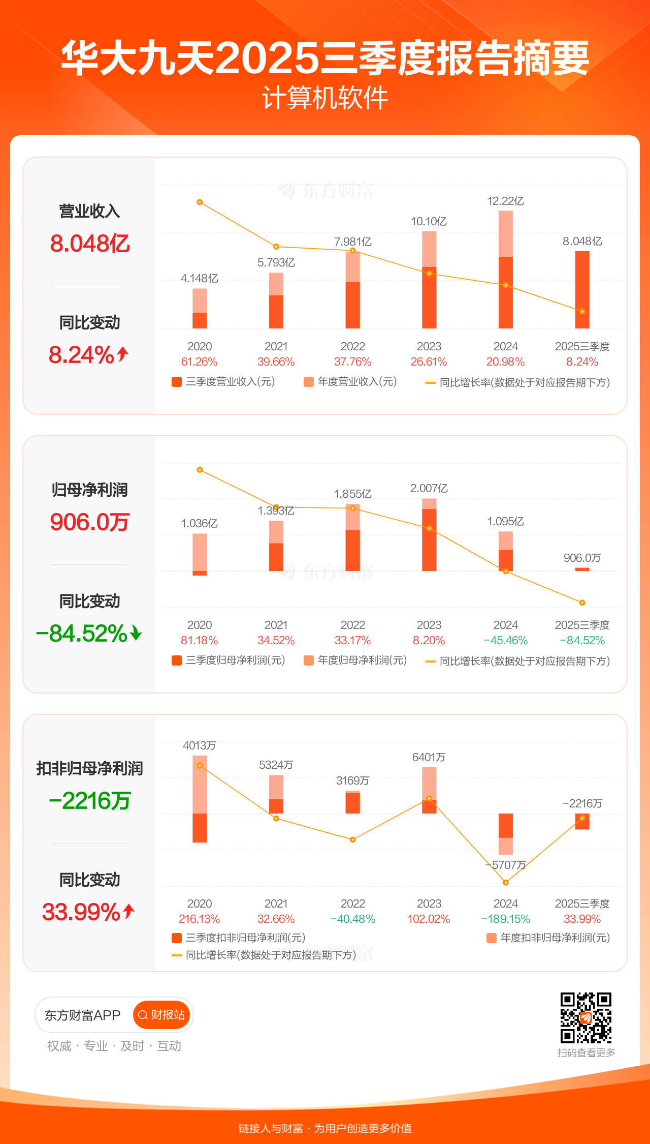 华大九天10月30日发布2025年三季报显示,公司前三季实现营业收入8.05亿元,同比增长8.24%;归母净利润906.03万元,同比下滑84.52%;扣非归母净利润-2215.63万元。