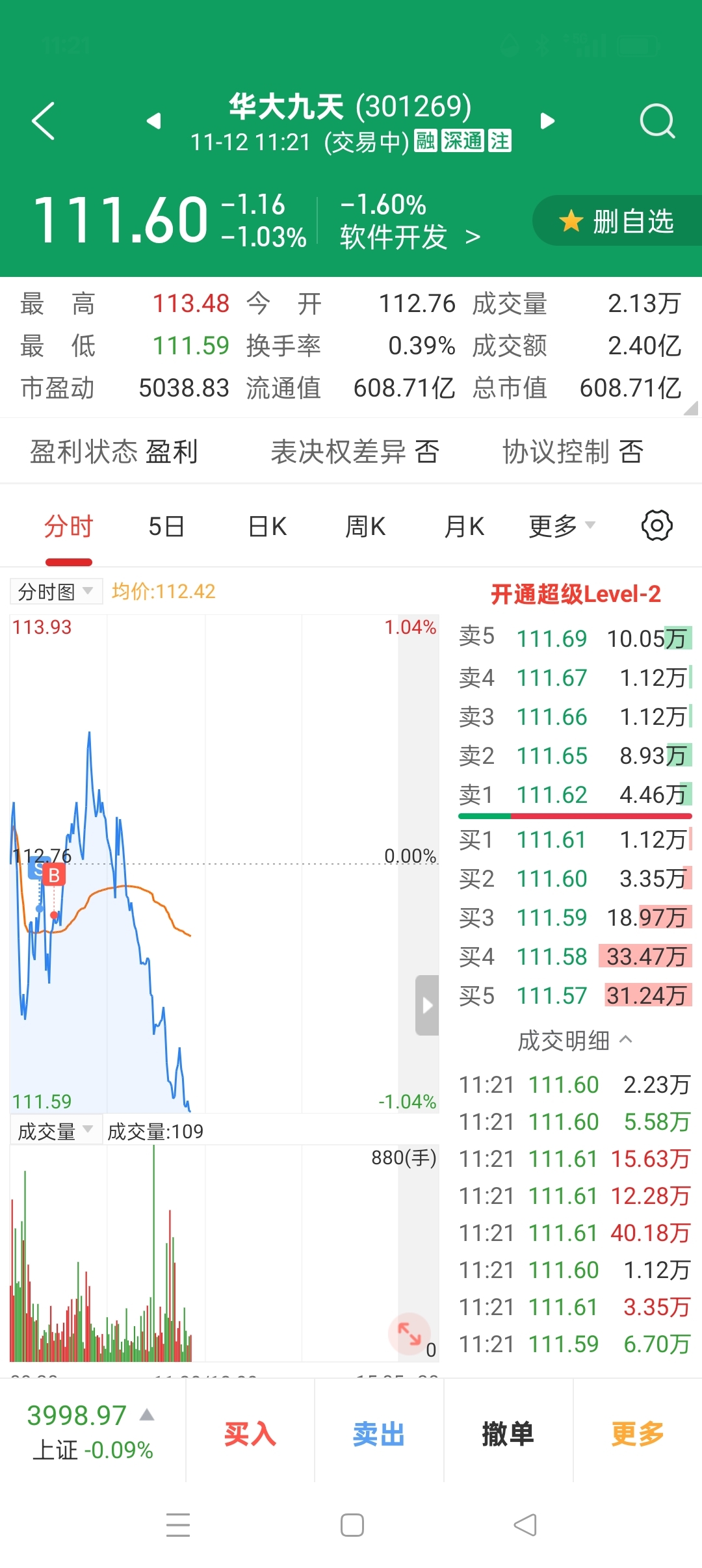 $华大九天(SZ301269)$ 真是,已经割肉卖了半仓,看有往上走的迹象又买回,挂113.6没卖出,又继续被宰割。