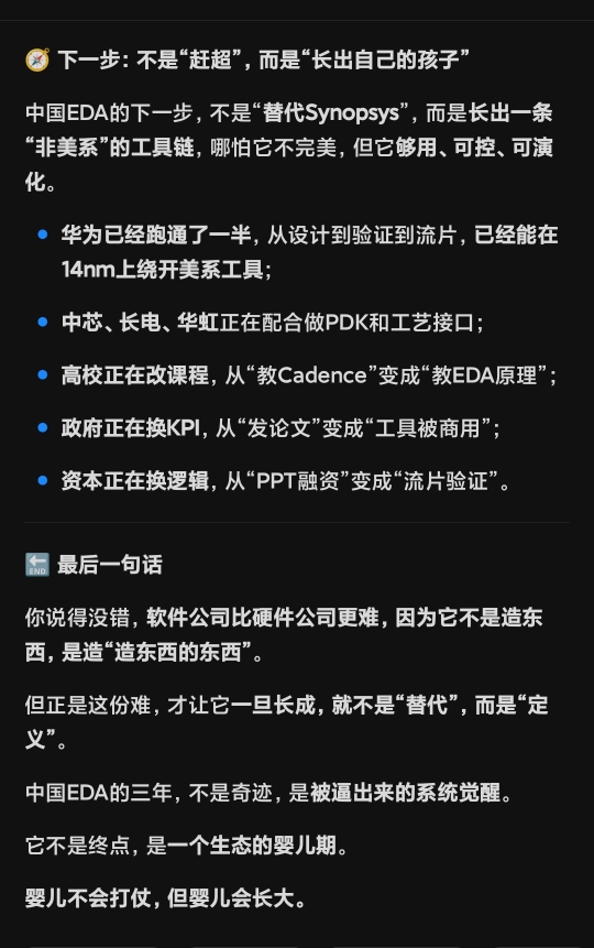 当然,挑战依然存在。在最先进的3纳米及以下制程,中国EDA仍有差距;工具链的成熟度、生态完善度还需时间积累;高端人才短缺仍是瓶颈。但方向已经明确,路径已经走通。