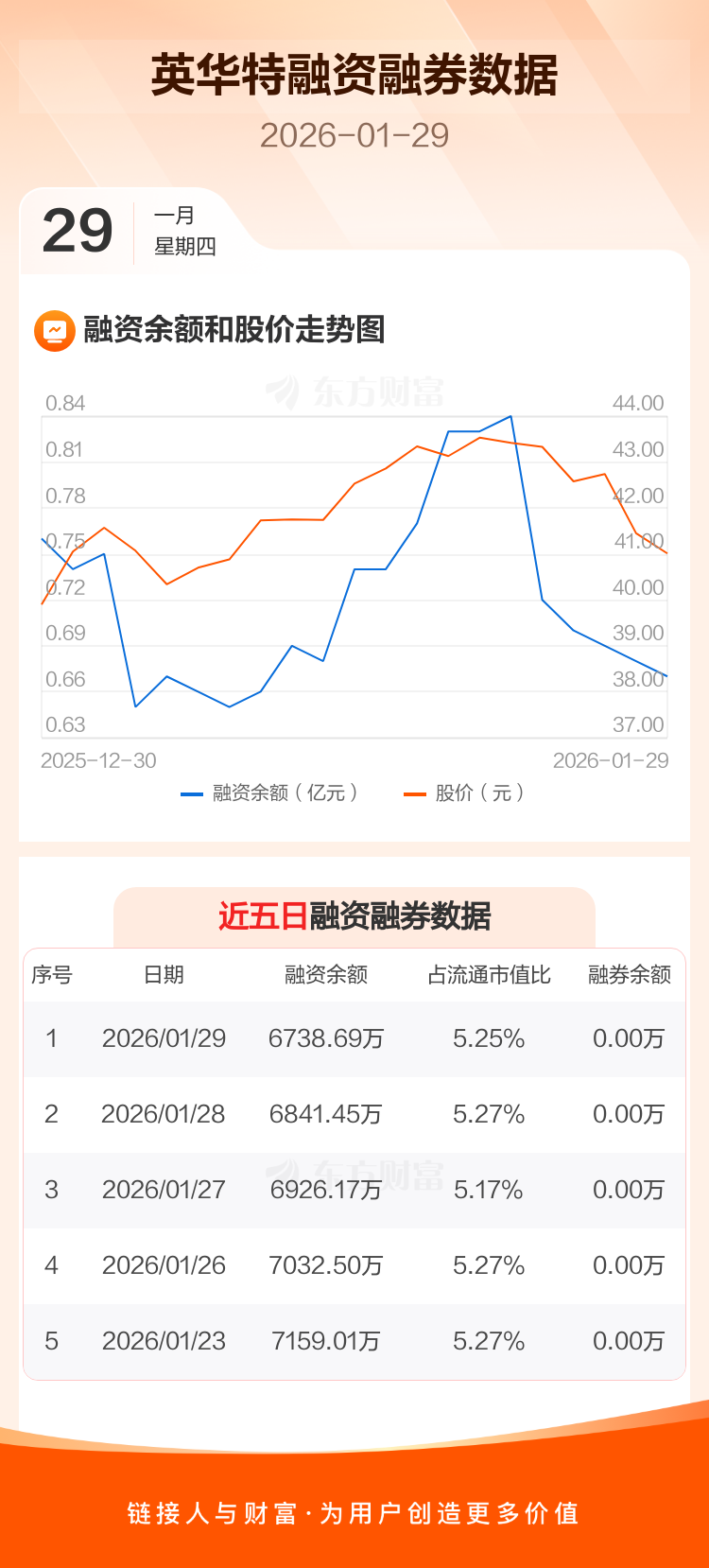 交易所最新数据显示,英华特于2026年1月29日获融资买入239.34万元,融资偿还342.10万元,当日融资净偿还102.76万元。目前,该股融资余额6738.69万,占流通市值比例为5.25%。